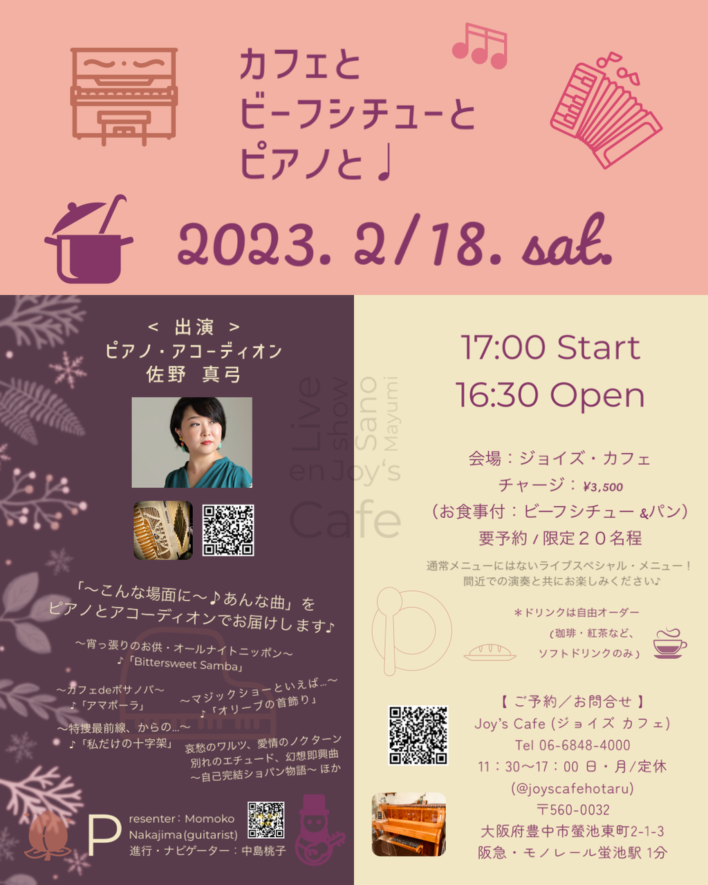 桃もおだてりゃ木に登る(なってますが🍑🌴笑)2/18(土)カフェとビーフシチューとピアノと(さのまゆみ♪)in ジョイズカフェ蛍池